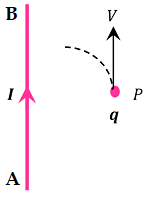 A stationary charge ( q ) is placed at point P near a metallic wire AB as shown in figure. Wire AB is carrying a current ( i ) . So, it will produce its magnetic field around it.